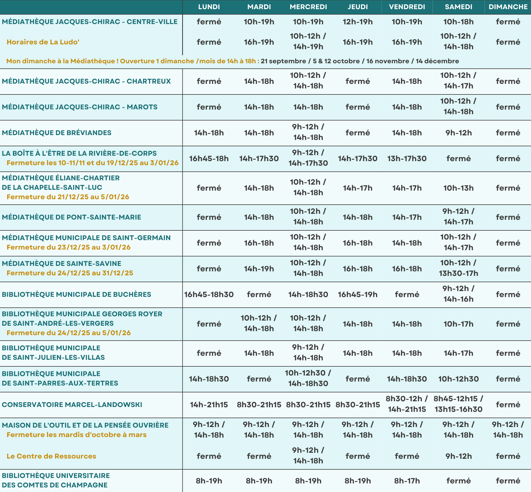 • en cas d’inscription payante, par courrier accompagné d’un chèque à l’ordre « régie de recettes inscriptions boutique Médiathèque Jacques Chirac Troyes centre » et à l’adresse postale :
