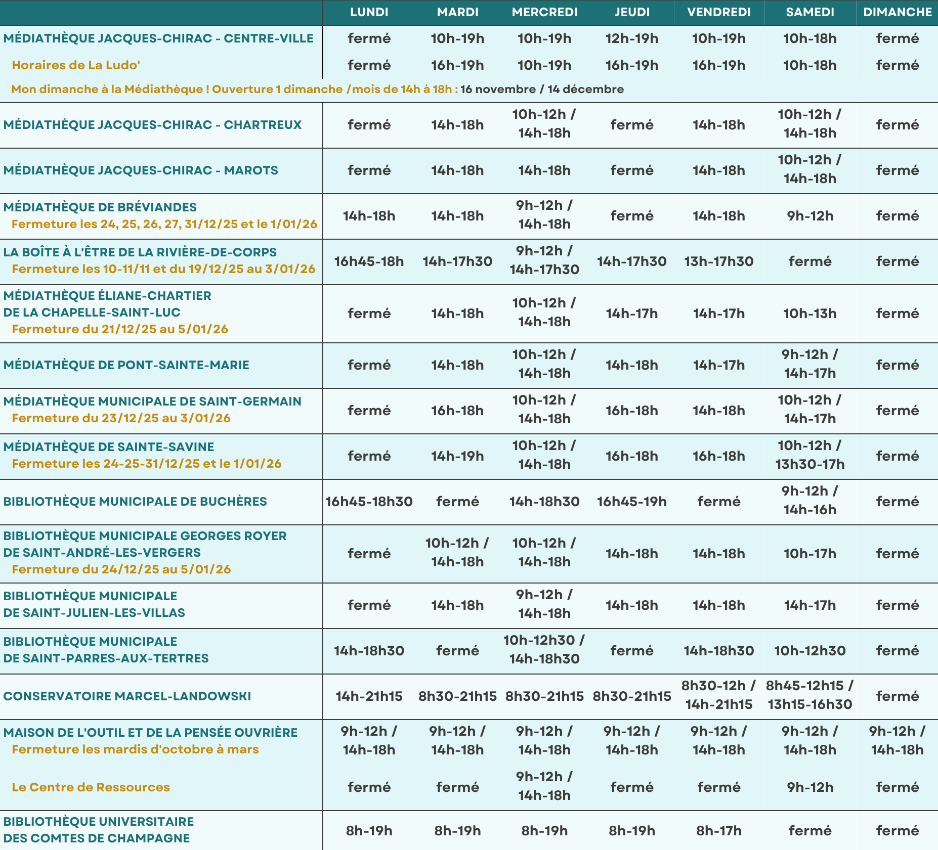 HORAIRES DES MÉDIATHÈQUES